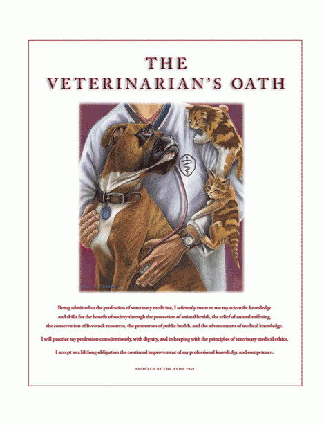 Being admitted to the profession of veterinary medicine, I solemnly swear to use my scientific knowledge and skills for the benefit of society through the protection of animal health and welfare, the prevention and relief of animal suffering, the conservation of animal resources, the promotion of public health, and the advancement of medical knowledge.I will practice my profession conscientiously, with dignity, and in keeping with the principles of veterinary medical ethics.I accept as a lifelong obligation the continual improvement of my professional knowledge and competence.