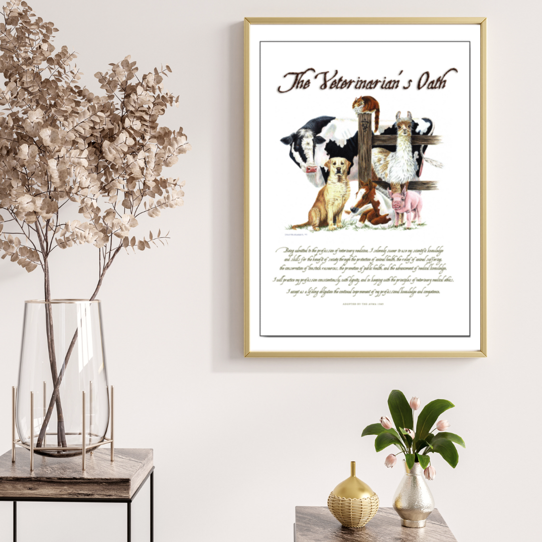 - Take advantage of your waiting room. Ease your clients anxiety with art, prose, and your intention. Choose from 6 different unique veterinary oath prints. Each piece is printed on a non-sheen 80# cover stock and was given an extra aqueous coating for protection. The prints are striking in color with custom script that will invite your clients to discover your intentions.