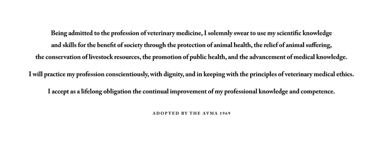 Being admitted to the profession of veterinary medicine, I solemnly swear to use my scientific knowledge and skills for the benefit of society through the protection of animal health and welfare, the prevention and relief of animal suffering, the conservation of animal resources, the promotion of public health, and the advancement of medical knowledge.I will practice my profession conscientiously, with dignity, and in keeping with the principles of veterinary medical ethics.I accept as a lifelong obligation the continual improvement of my professional knowledge and competence.